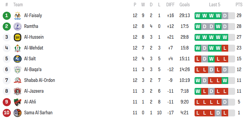 يلتقط الحسين إربد المركز الثالث بـ27 نقطة بعد فوزه على السلط 1-0، مما يقلص الفارق إلى نقطة واحدة، بينما يحتل الوحدات الرابع برصيد 23 نقطة عقب خسارته المفاجئة أمام شباب الأردن 0-1.