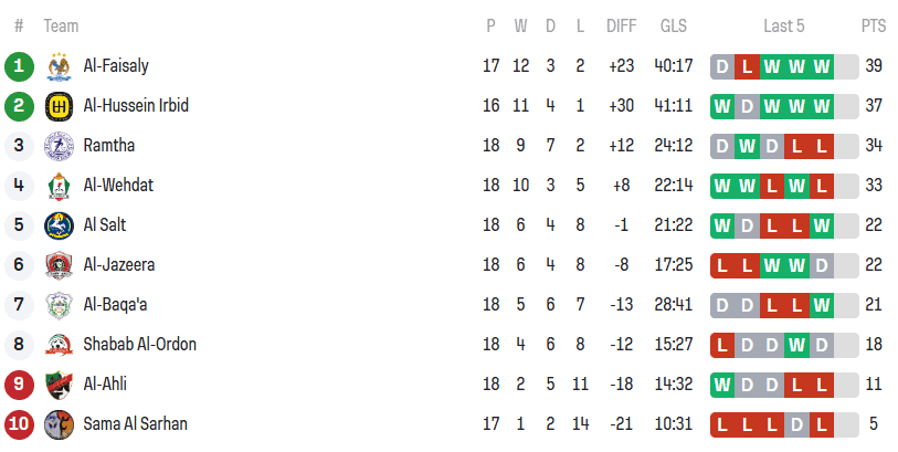 وتشهد بطولة الدوري هذا الموسم منافسة قوية بين الأندية المتقدمة في جدول الترتيب، إذ يواصل نادي الفيصلي التربع على القمة برصيد 39 نقطة، في وقت لا تزال فيه الفوارق النقطية بين الفرق الكبرى محدودة، ما يزيد من أهمية مباريات الجولات المتبقية ويجعل نتائجها مؤثرة في سباق اللقب.