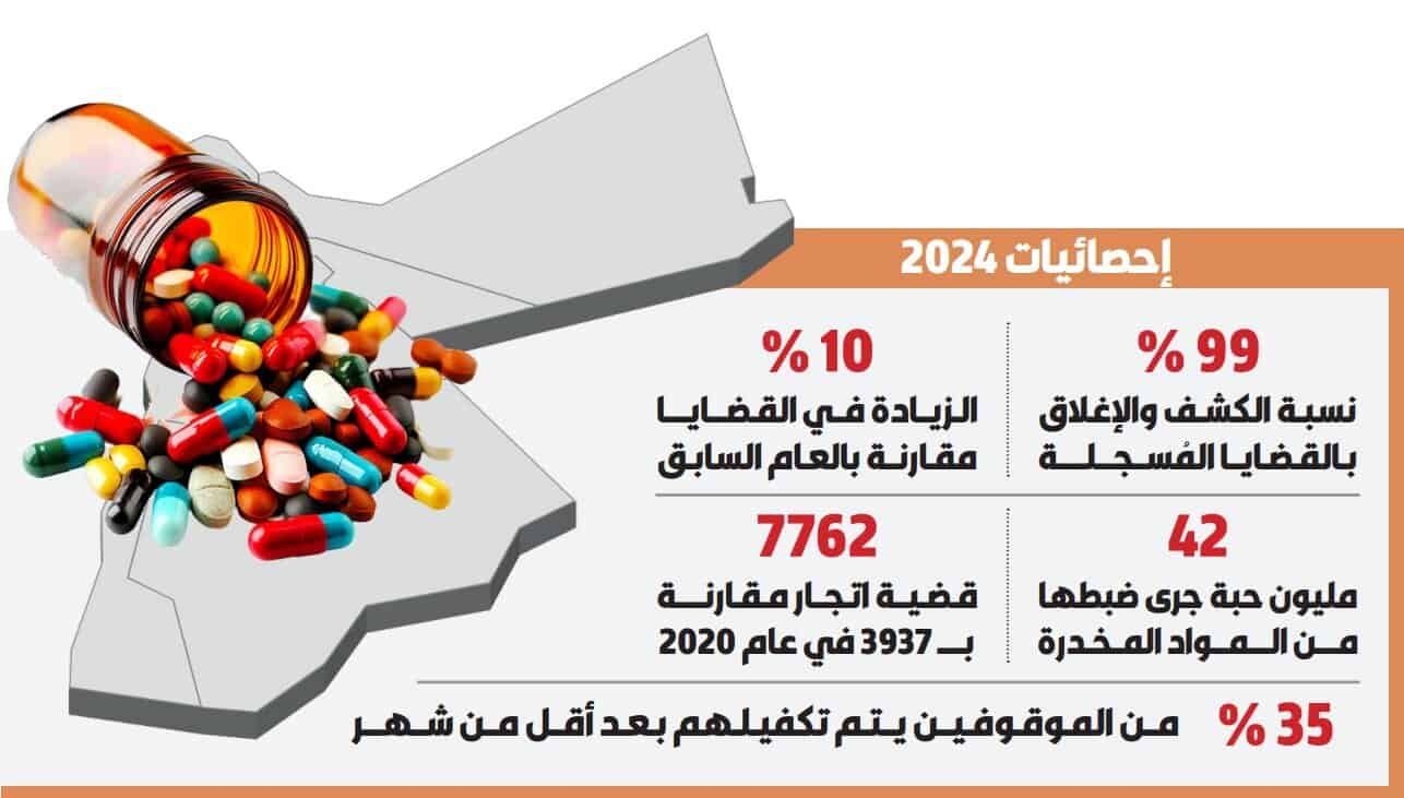 لم تعد قضايا المخدرات في الأردن أحداثًا متفرقة، بل باتت أرقامها ترسم منحنىً صاعدًا عامًا بعد عام. فبحسب التقرير الجنائي لعام 2024 الصادر عن مديرية الأمن العام سُجِّلت 25,260 قضية، مقابل 22,956 قضية في 2023—أي زيادة تقارب 10%. وهذه القفزة ليست مفاجِئة بالنظر إلى مسار العقدين الماضيين؛ إذ تضاعفت القضايا المضبوطة أكثر من 20 مرة منذ عام 2000 حين لم تتجاوز نحو ألف قضية.